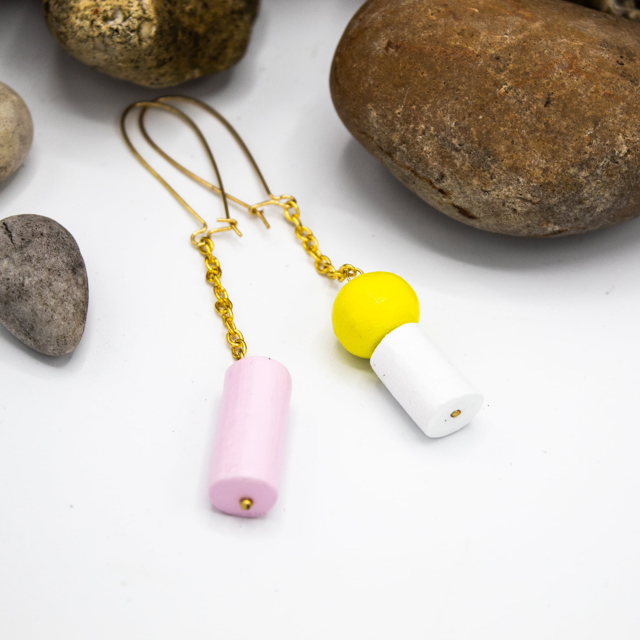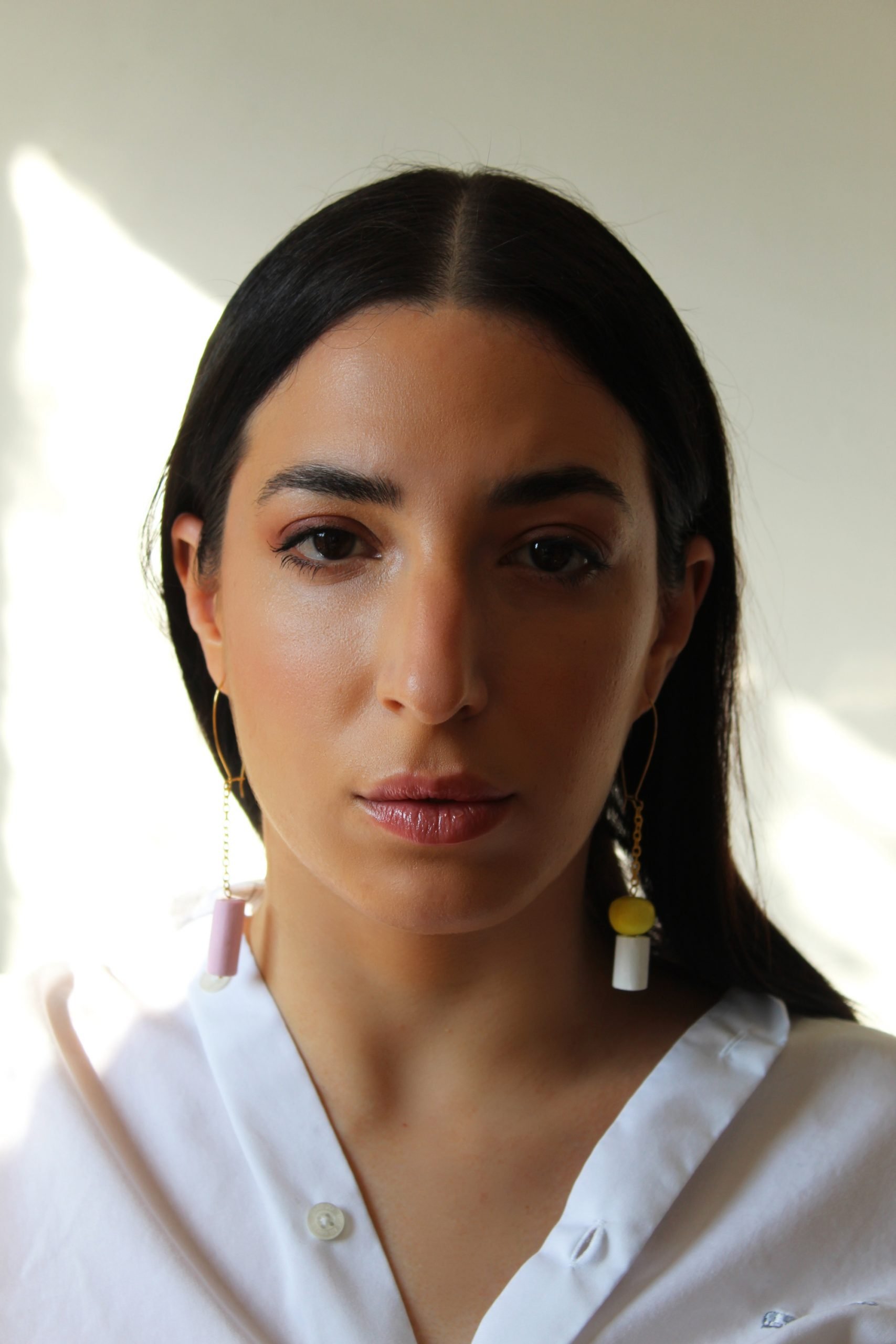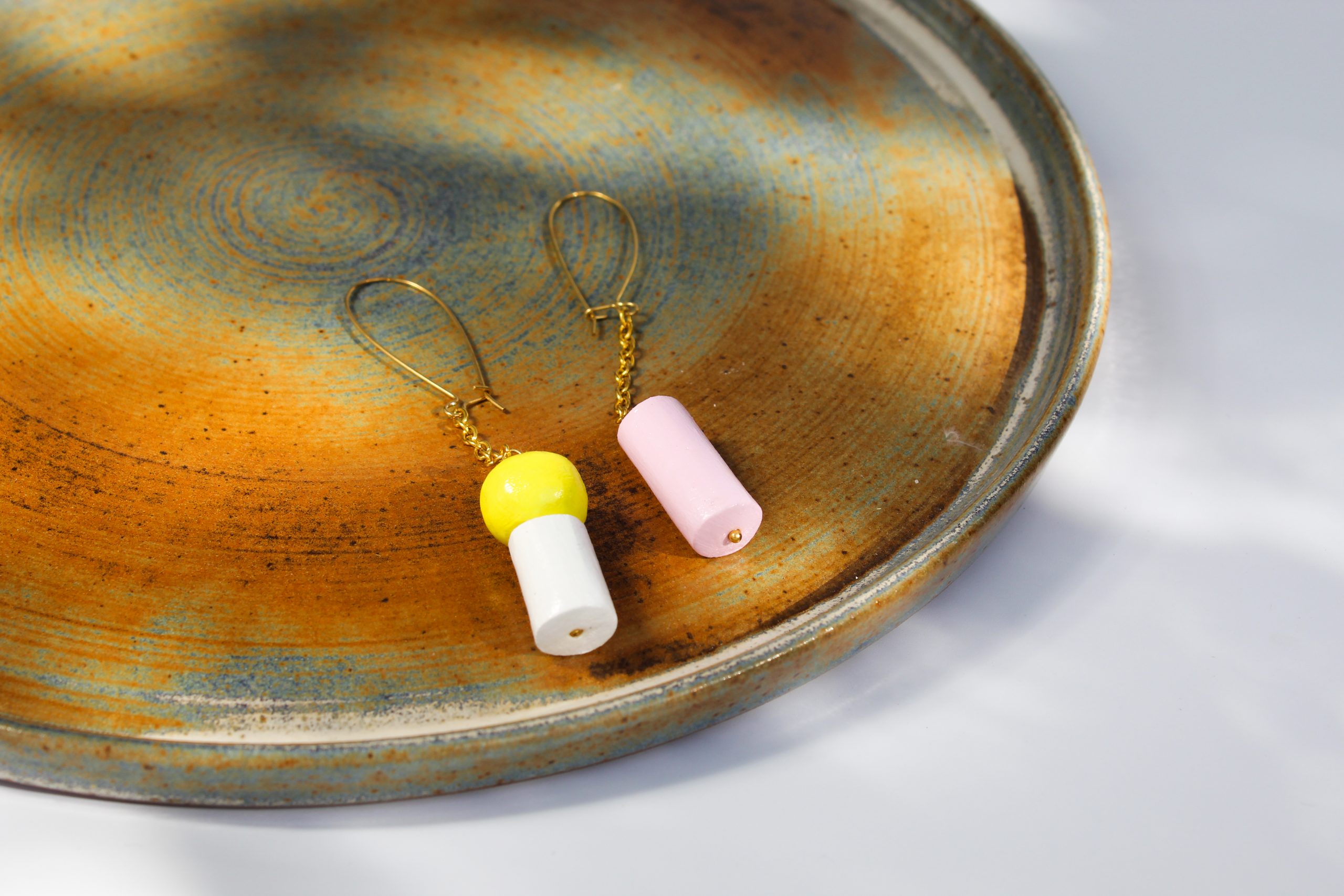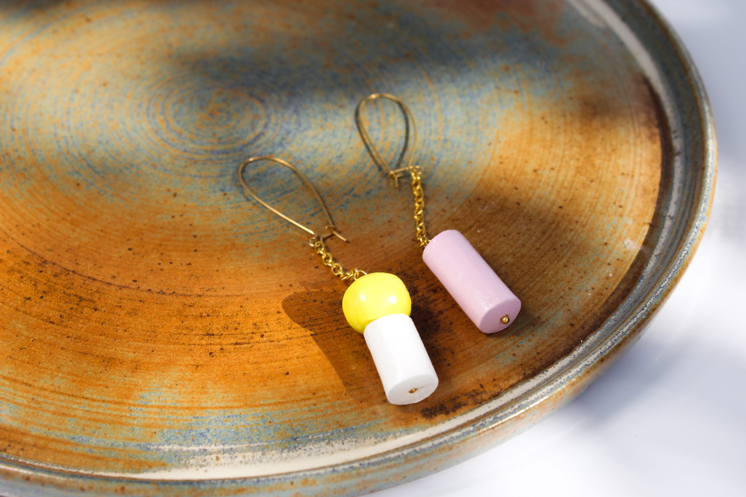 These earrings are the beginning of the transition from straight shapes to cylinders and spheres.